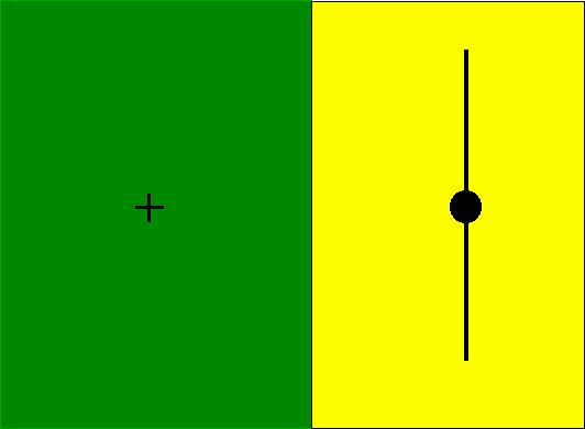 Ga op een meter van het scherm zitten. Sluit je linkeroog en fixeer je op het kruisje. Terwijl je je blijft fixeren op het kruisje beweeg je je nu rustig naar het scherm toe. Wat zie je?.