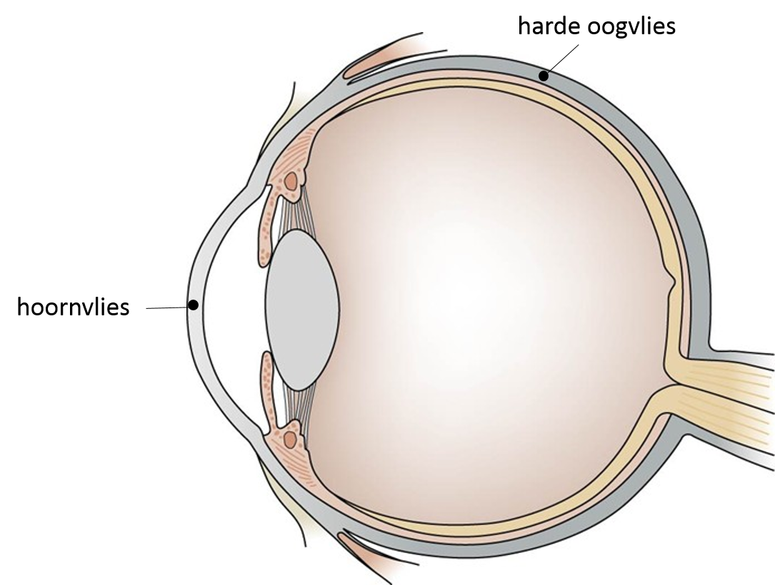 Het witte deel dat je ziet van je oog behoort tot het harde oogvlies. Dit is het eerste vlies van de 3 oogvliezen waaruit onze ogen bestaan. Het harde oogvlies bestaat uit stevig, wit bindweefsel dat het oog vorm geeft en de tere interne delen van het oog beschermt. De oogspieren zijn bovendien aan dit hard oogvlies vastgehecht. Vooraan is dit vlies volledig transparant en dun zodat licht binnen in het oog geraakt. Dit transparante deel van het harde oogvlies wordt het hoornvlies genoemd.