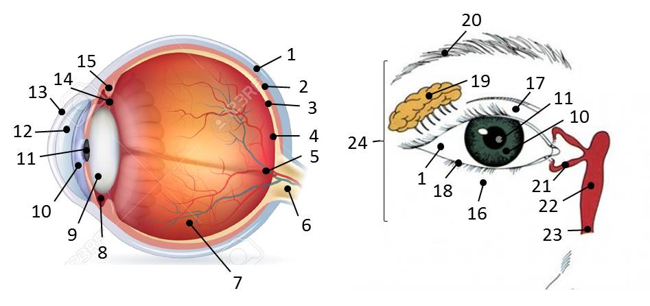 | R | Harde oogvlies | Buitenste witte rigide laag die het oog zijn vorm geeft. |