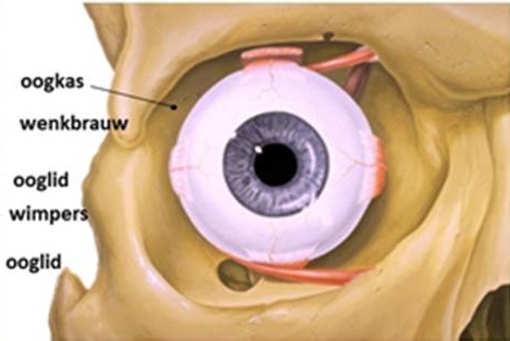 | E | Oogkas | Holte in de schedel waarin de ogen vastgehecht zitten via spieren. De oogkas biedt het oog bescherming. |