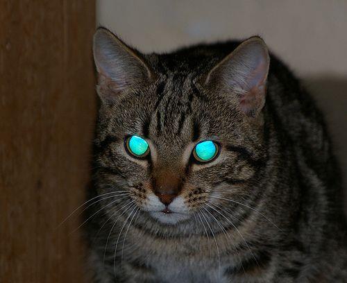 Uit het vorige filmpje weet je dat ze eigenlijk geen licht geven maar licht reflecteren. Dit is mogelijk door de aanwezigheid van het zogenaamde tapetum lucidum. Dit is een lichtreflecterende laag van cellen direct achter of soms in het netvlies van nachtdieren. Door de reflectie van het licht komt er meer licht op de fotoreceptoren waardoor deze dieren beter kunnen zien in het donker. Naast katten beschikken nog tal van andere dieren over een tapetum lucidum zoals o.a. herten, koeien, leeuwen, wasberen, enz.