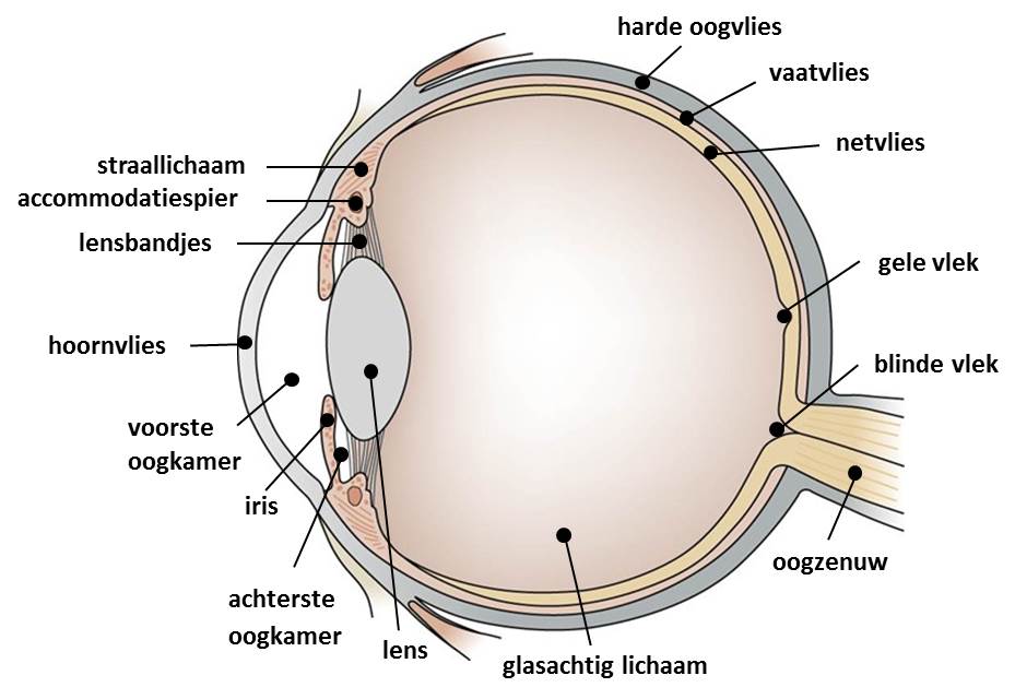 Onder het harde oogvlies ligt het 2de oogvlies: het vaatvlies. Het vaatvlies bevat veel bloedvaten waardoor het een voedende functie heeft voor het oog. Dit vaatvlies splitst vooraan in het oog in een eerste deel dat het straallichaam met de accommodatiespier bevat en een tweede deel: de iris of het regenboogvlies. Het straallichaam houdt de elastische en transparante ooglens op zijn plaats via de lensbandjes. Deze delen zijn samen belangrijk voor de scherpstelling van beelden zoals in les 2 duidelijk zal worden. De iris is het gekleurde gedeelte van het oog. De kleur ervan wordt bepaald door de hoeveelheid pigment dat aanwezig is. Heb je bruine ogen dan is er veel pigment aanwezig in je iris. Heb je blauwe ogen dan heb je weinig pigment. Het regenboogvlies verdeelt het gebied voor de lens in 2 delen namelijk de voorste oogkamer en de achterste oogkamer. Beide kamers zijn gevuld met helder vocht dat water, zouten, suikers en eiwitten bevat. In de iris bevindt zich ook een opening, de pupil. Hierdoor kan licht in het oog binnen. De hoeveelheid licht dat binnenkomt via de pupil wordt gereguleerd door de iris en wordt uitgelegd in les 2. Het gedeelte van het oog achter de lens wordt opgevuld door een doorzichtige geleiachtige massa die het glasachtige lichaam wordt genoemd. Dit geeft ook structuur aan de oogbol.