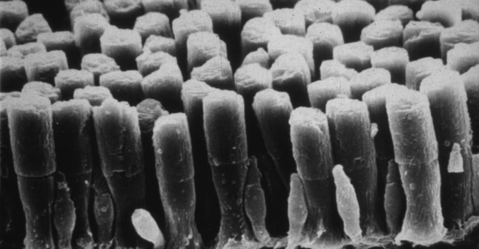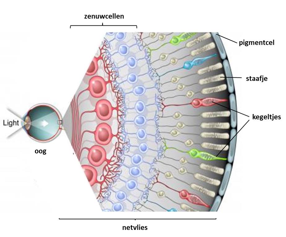 Het derde en binnenste oogvlies is het netvlies. Dit is de lichtgevoelige laag die aan de buitenzijde afgelijnd is met pigmentcellen. Deze absorberen het licht dat niet geabsorbeerd wordt door de zintuigcellen of fotoreceptoren. Er zijn twee types fotoreceptoren namelijk de staafjes en de kegeltjes. Staafjes detecteren licht terwijl kegeltjes kleuren detecteren. De verdeling van beide types doorheen het netvlies is verschillend. Er komen ongeveer 100 miljoen staafjes en 10 miljoen kegeltjes voor in het netvlies. De staafjes liggen meer aan de buiten zijde terwijl de kegeltjes centraler gelegen zijn. Beide types fotoreceptoren kunnen geprikkeld worden indien er licht op invalt. De prikkel wordt doorgegeven via de zenuwcellen uit het netvlies aan de hersenen. Deze prikkel komt tot in de hersenen door de oogzenuw waarin alle zenuwcellen verenigd liggen. In de hersenen wordt deze prikkel dan verwerkt. Hoe dit precies gebeurt ontdek je verder in les 2 en 3.