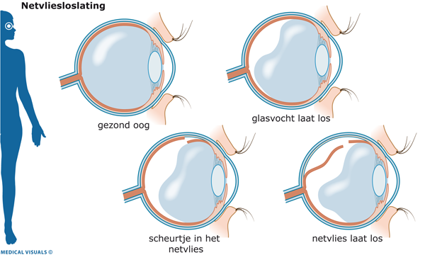 Het netvlies kan loskomen van de binnenkant van de oogbol. Dit noemt men netvliesloslating of ablatio retinae. Het start meestal doordat het glasachtig lichaam krimpt en loskomt van het netvlies. Dit leidt ertoe dat de persoon in kwestie wazig, troebel of lichtflitsen ziet. Soms laat komt het glasachtig lichaam niet volledig los van het netvlies en trek het hierdoor scheurtjes in het netvlies. Doordat het glasachtig volledig of onvolledig loskomt kan ook het netvlies loskomen van de oogbol. Dit is zeer gevaarlijk vermits dit tot acute blindheid kan leiden. Een operatie is dan ook noodzakelijk. Hier trachten plaatsen het netvlies terug op zijn plaats en herstellen ze eventuele scheurtjes.
