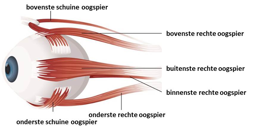 Je kan je ogen naar boven, onder, links en recht bewegen of zelfs helemaal ronddraaien. Probeer het maar eens! Dit kan door de oogspieren die de oogbal vasthechten aan de oogkas. Er zijn vier rechte en twee schuine oogspieren. De oogspieren werken samen en fixeren de ogen zo op een specifiek fixatiepunt.
