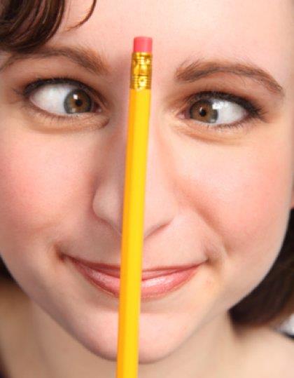 Deze mevrouw kijkt scheel. Je kan dit expres doen maar bij sommige mensen is dit effectief een afwijking. Bij hun zijn de oogspieren niet in staat het oog te richten op het fixatiepunt. De ogen kijken dan niet in dezelfde richting en we spreken van scheelzien of strabisme.