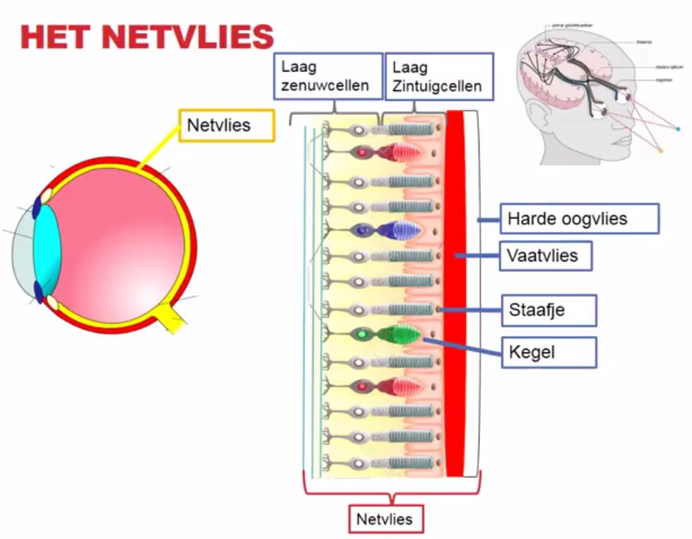 Dit zijn de zintuigcellen van je oog, gevormd door miljoenen staafjes en kegeltjes. Ze zetten de lichtprikkel om in een impuls. Deze impulsen worden in je hersenen verwerkt.