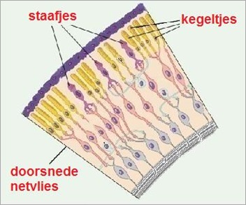 De lichtgevoelige cellen waarmee het netvlies bedekt is worden naar hun vorm onderscheiden in kegeltjes en staafjes. Kegeltjes verschillen van staafjes in het feit dat ze het beste werken in fel licht. Kegeltjes zijn minder lichtgevoelig dan staafjes (waarmee iemand in donkere situaties kan zien), maar maken kleurwaarneming mogelijk. Met kegeltjes is het zicht scherper en kunnen sneller veranderingen in het beeld worden waargenomen dan met staafjes, omdat hun responstijden lager zijn dan die van staafjes.