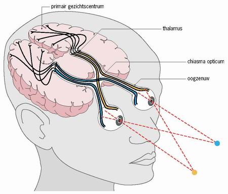 Misschien herinner je je nog van een andere les dat de rechterhelft van ons lichaam in verbinding staat met de linker helft van onze hersenen en omgekeerd? Bij de ogen is dit niet anders. Uit elke oogbol vertrekt één oogzenuw en deze twee oogzenuwen kruisen elkaar gedeeltelijk. Het kruispunt wordt het optisch chiasma genoemd. In het optisch chiasma kruisen de zenuwceluitlopers met de impulsen die afkomstig zijn van het aan de neuszijde gelegen netvliesgedeelte.