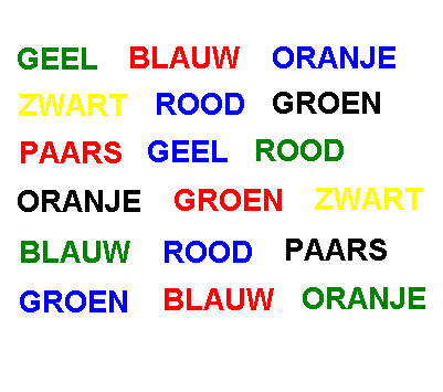 Je hersenen en je ogen kunnen elkaar soms ook heel hard tegenwerken. Probeer maar eens om deze kleuren één voor één op te noemen (dus kleur, niet de tekst):