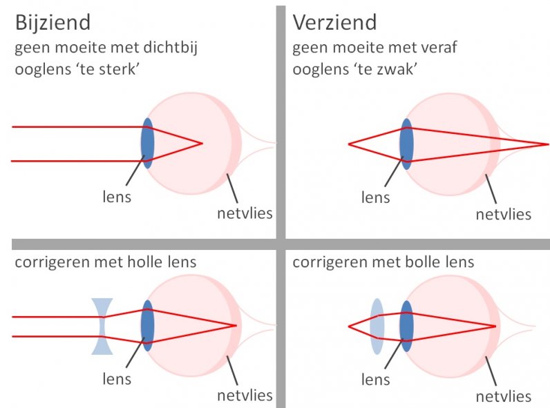 Om deze twee afwijkingen te corrigeren, kan de kromming van het lenzensysteem veranderd worden. Brillen of contactlenzen zorgen ervoor dat het licht naar de juiste plaats wordt afgebogen. Een bolle lens corrigeert verziendheid, een holle lens bijziendheid.